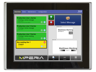 Največja prednost Matthews Marking Sistemov je vmesnik MPERIA, ki lahko nadzoruje vse tiskalnike znamke Matthews Marking ali pa katere druge (TSC, Hitachi, Toshiba, CAB,...) z enim kontrolerjem. Omogoča vam popolen nadzor, vaše tiskalniške flote, kar vam olajša nadzor proizvodnih linij in tako pospeši proizvodnjo in zmanjša stroške obratovanja. S povečanim nadzorom hitreje odpravljate napaka in zmanjšate obdobje nedelovanja naprav. Vmesnik MPERIA vam olajša tudi pregled in izdelavo napisov, saj ne potrebujete več računalnika, ampak lahko napise kreirate kar na vmesniku.