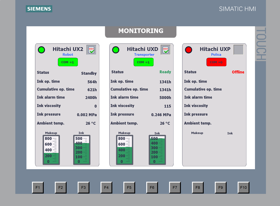 Na sliki lahko opazite primer nadzora različnih modelov Hitachi CIJ tiskalnikov. Niste pa omejeni samo na tovrstne naprave. Z uporabo različnih komunikacijskih protokolov lahko nadzirate tudi laserske in inkjet tiskalnike ter print&apply sisteme.