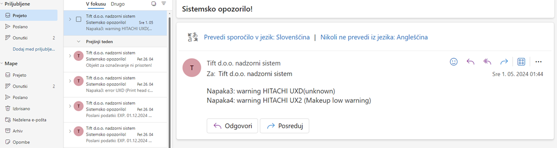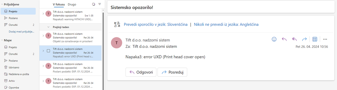 Če se pojavi težava, kot na primer nizek nivo črnila, odstranjen pokrov tiskalne glave in podobno, jo bo krmilnik Siemens tudi pravočasno zaznal in obvestil pristojno osebo prek elektronske pošte. Hiter odziv pomeni hitro razrešitev težave in posledično nižje stroške vzdrževanja.