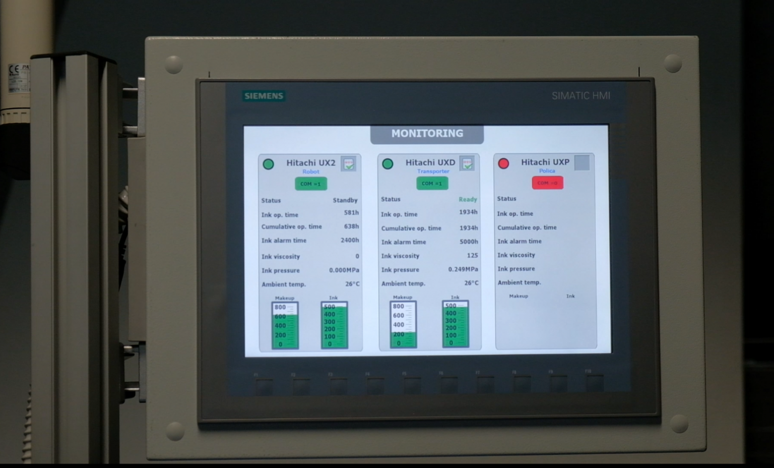 Na sliki je prikazan primer nadzora Hitachi CIJ tiskalnikov, vendar to ni omejeno zgolj na te naprave. Siemens krmilnik podpira različne komunikacijske protokole, s katerimi lahko upravljate tudi laserske in ink-jet tiskalnike, print & apply sisteme ter druge označevalne naprave različnih proizvajalcev.