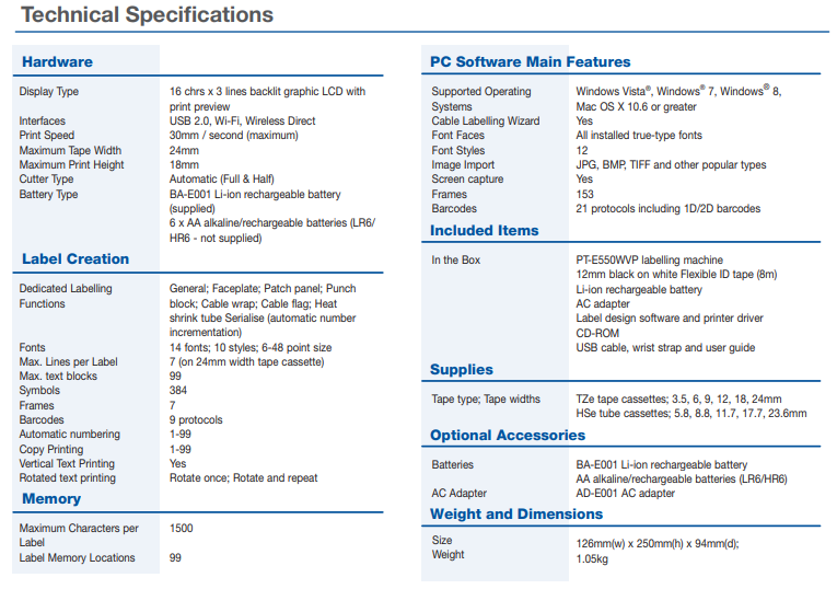 Brother PT-E550WVP ročni tiskalnik nalepk, za hitro in enostavno označevanje na terenu ali pisarni. Brother PT-E550WVP je primeren za vse, ki označujejo kable, ohišja, dodatke ali pa potrebujejo označiti orodja in druge delovne pripomočke. Vzdržljive plastificirane nalepke pa so primerne za vsa okolja.