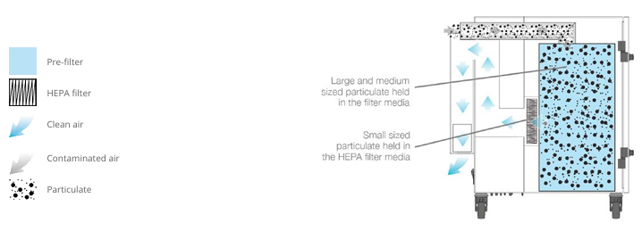 Sistem uporablja HEPA filter, ki z večstopenjsko filtracijo odstrani do 99,99 % delcev velikosti do 0,3 µm.
